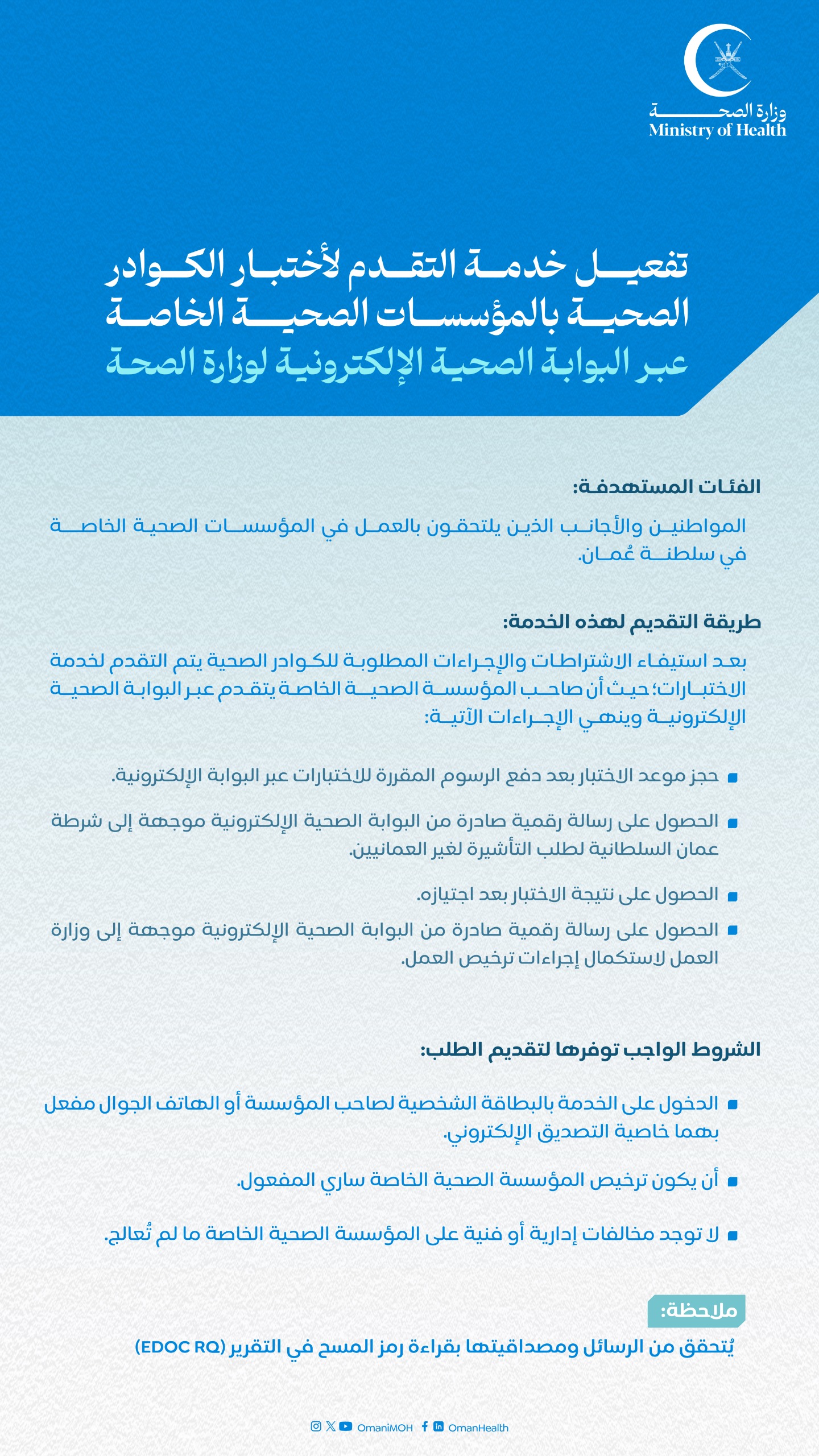 Registering and listing individuals who practice health professions in the medical, nursing, pharmacy and allied health from inside and outside the Sultanate of Oman who wish to work in the government and private healthcare institutions.